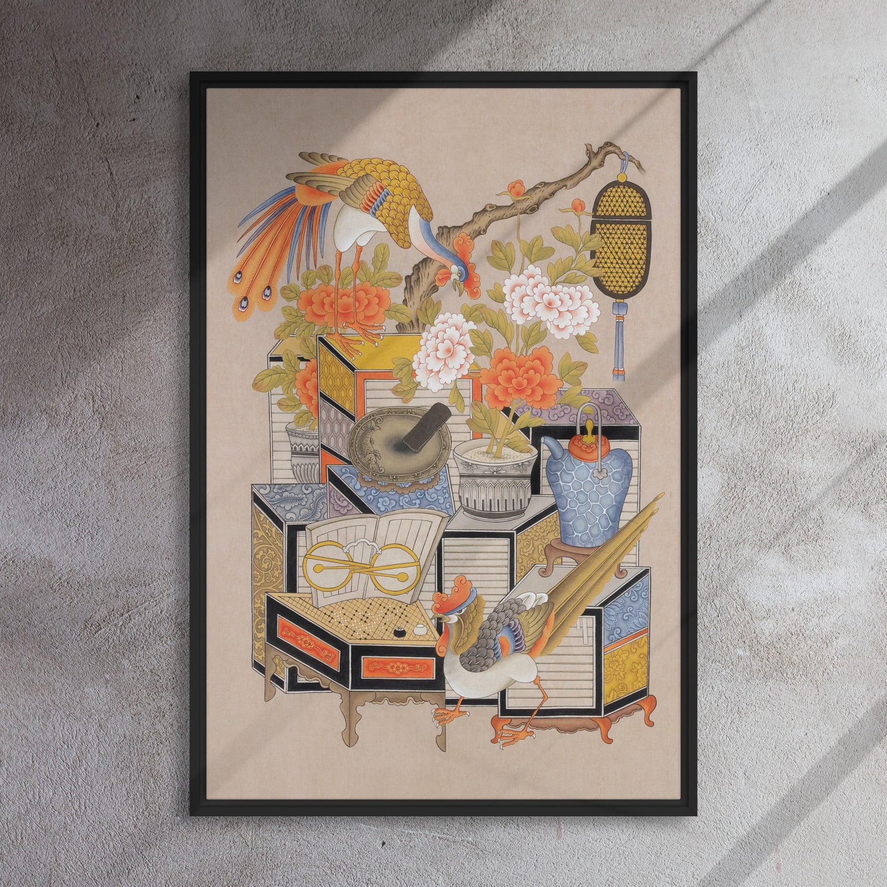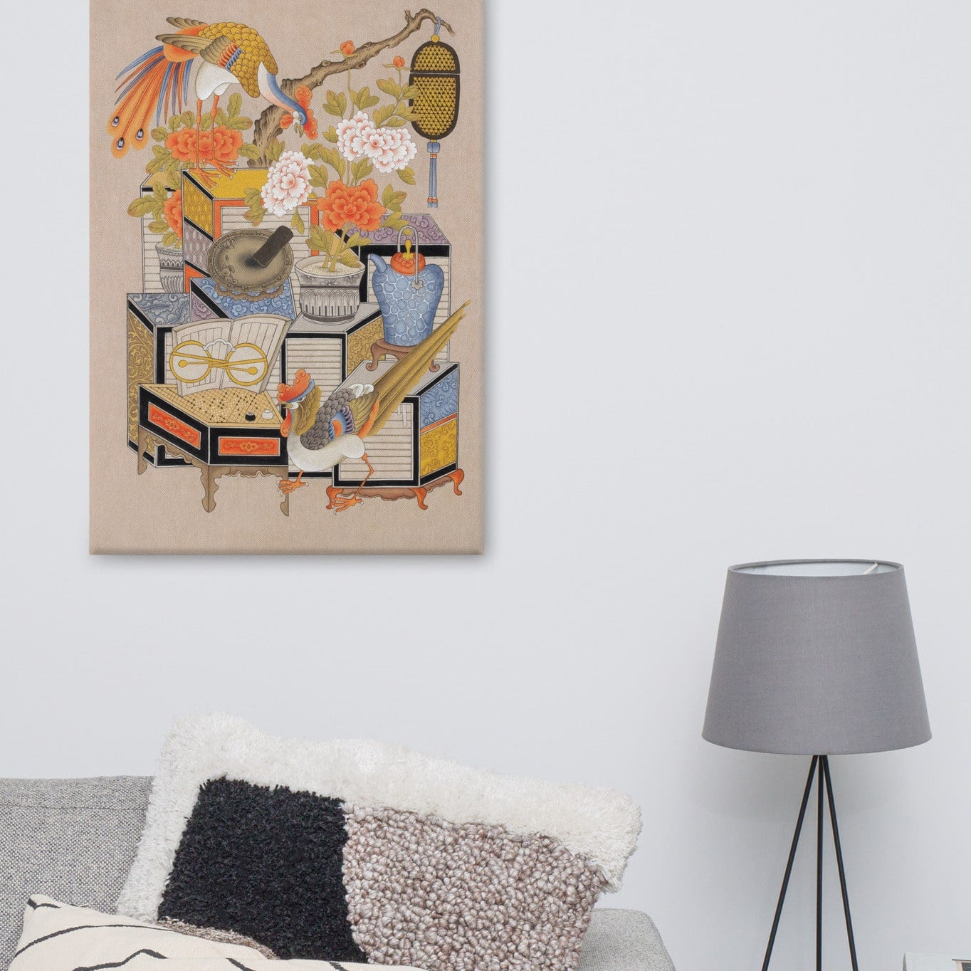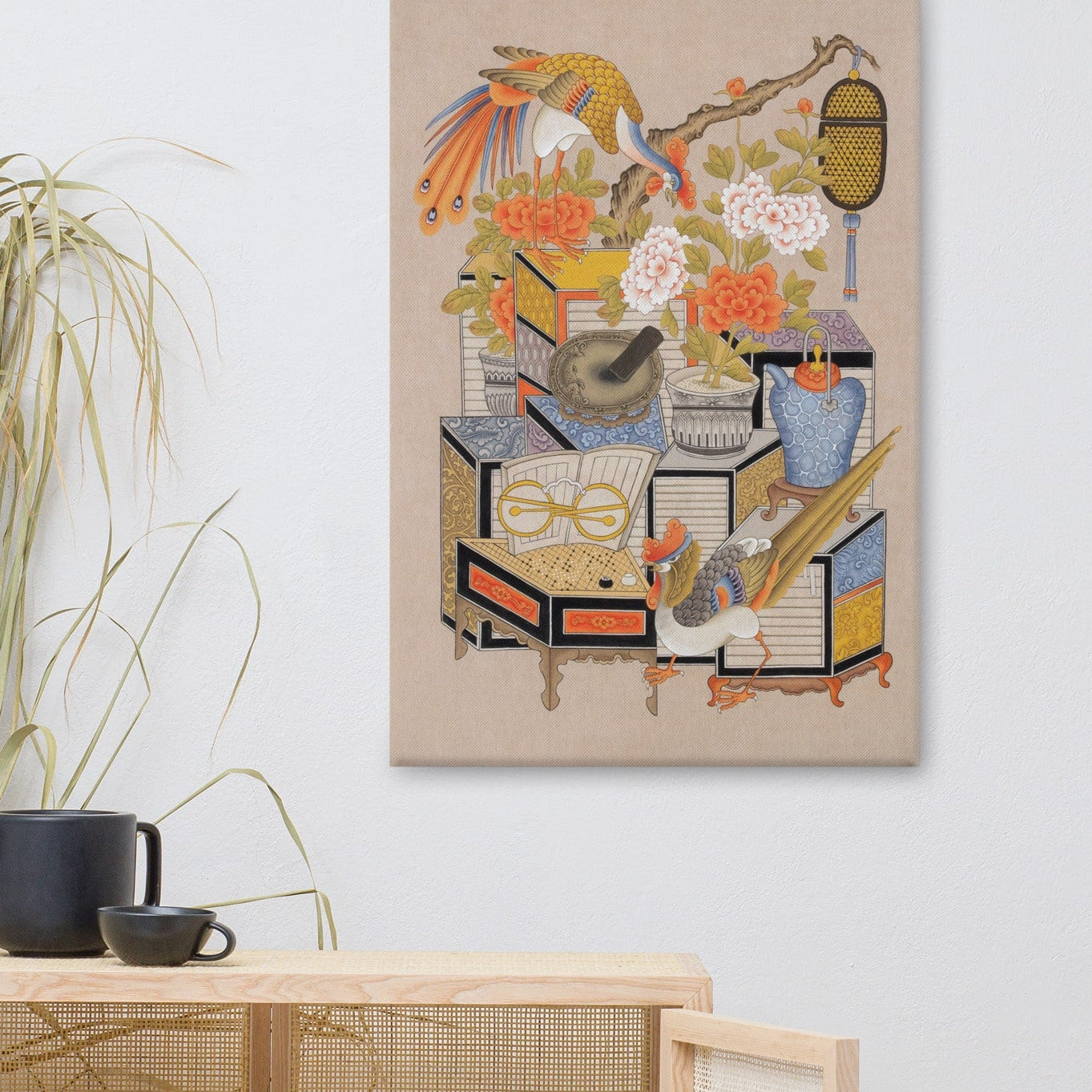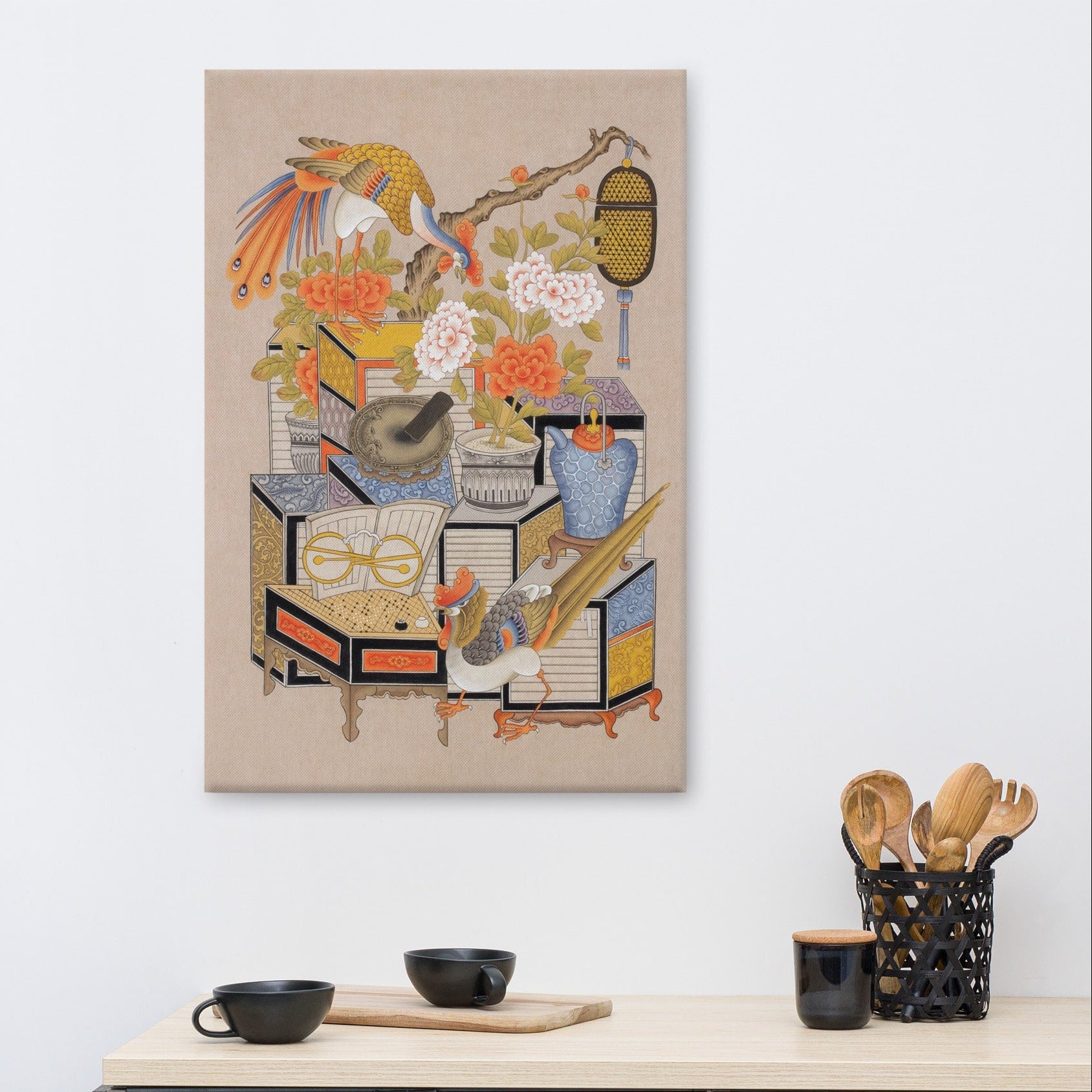 Cette œuvre sur toile réinterprète le motif classique Chaekgeori.