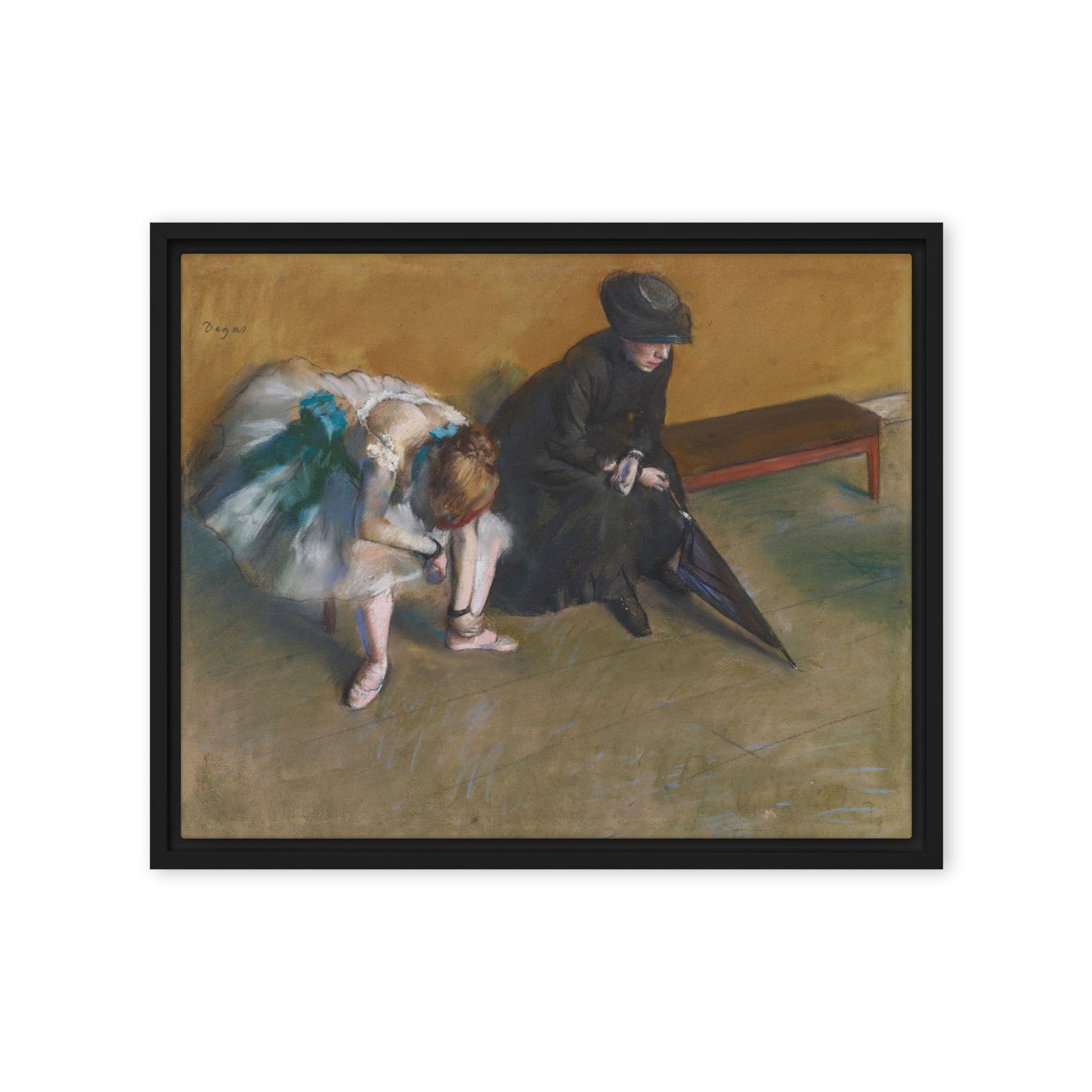 La mise en regard de la jeune danseuse et de l'accompagnatrice vêtue de sombre fait subtilement référence aux structures sociales du monde du ballet parisien au XIXe siècle.
