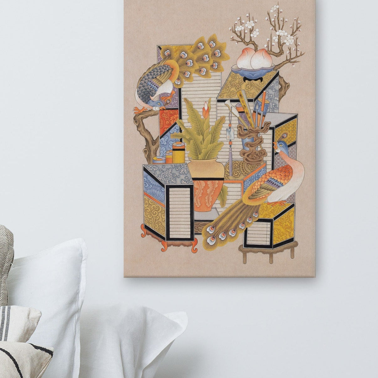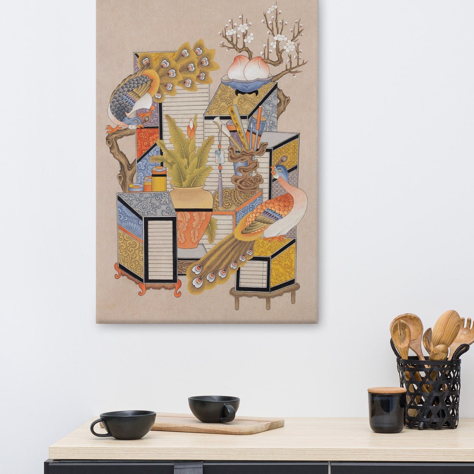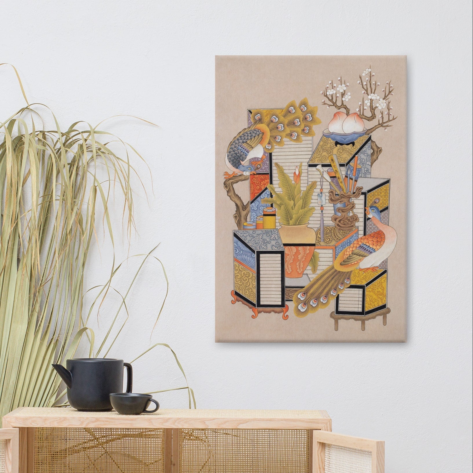 This peacock-centered Chaekgeori understands Longing for Knowledge as a timeless pursuit of inner balance and cultivated living.